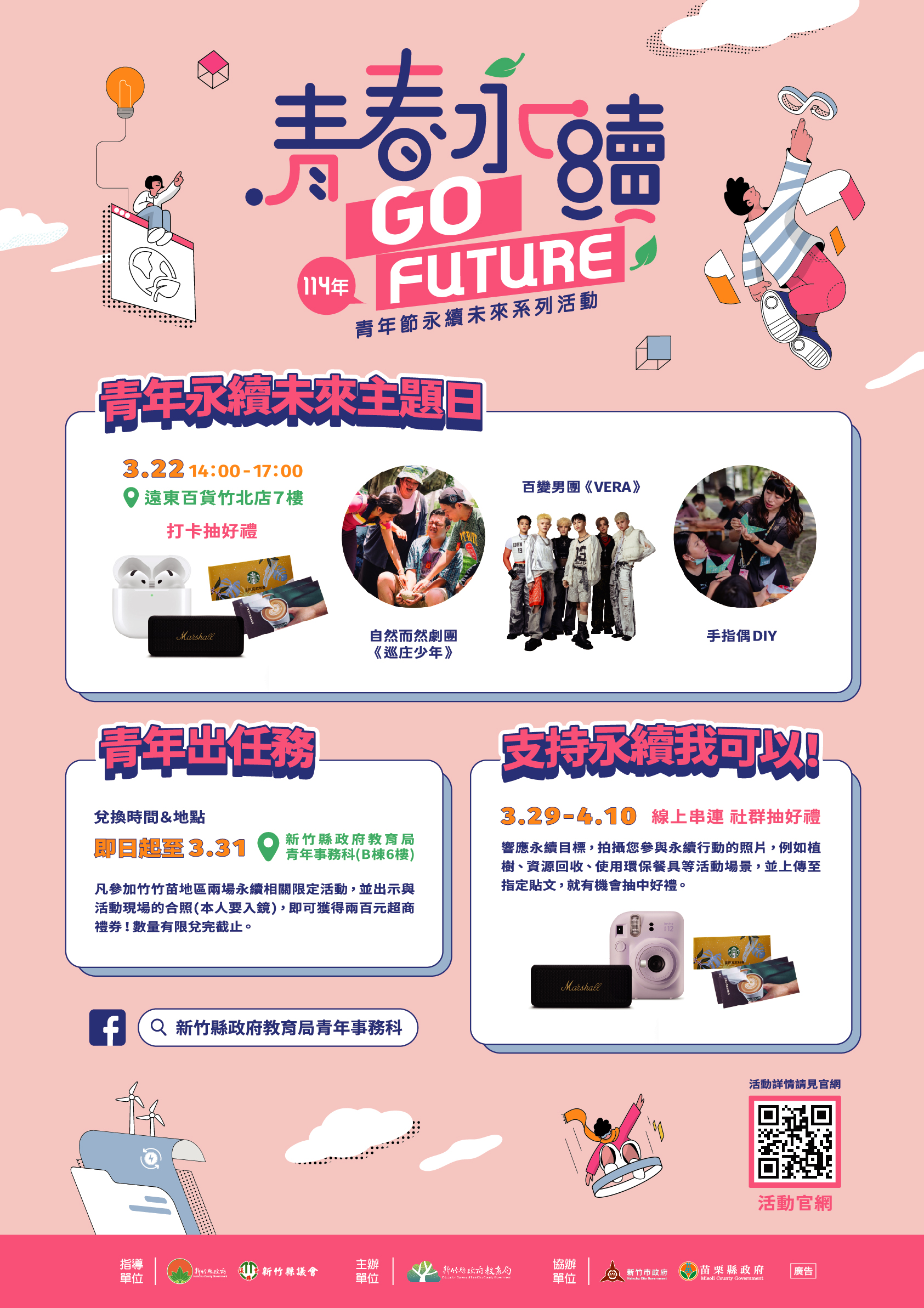 為推廣青年永續活動,邀請民眾透過行動展現對環境保護與永續發展的支持!響應永續拍攝您參與永續行動的照片,例如植樹、資源回收、節能減碳、環保手作等活動生活照片,上傳至社群平台將照片上傳至新竹縣政府教育局青年事務科(Facebook)指定貼文,並標記好友加入指定的活動標籤(#青春永續撼動未來),即可完成參加,就有機會抽中好禮。